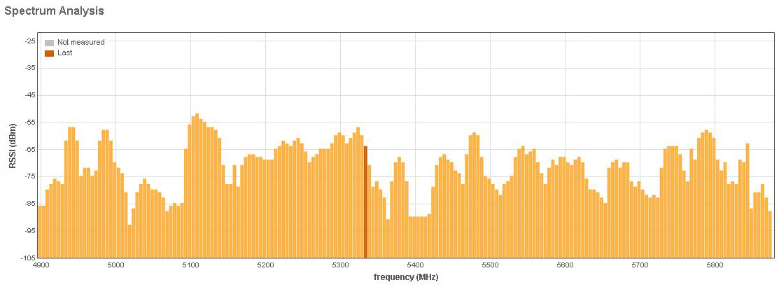 Por supuesto, no todo es por un motivo filosófico; hay detrás razones técnicas muy poderosas. Pero antes de entrar en ellas, dejadme que os muestre una captura del espectro en 5GHz en una instalación «difícil»: