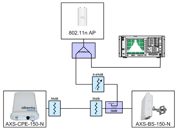 Conectamos todo y medimos en laboratorio la pérdida de los 3 caminos que nos interesan: CPE a estación base Albentia, AP interferente a estación base Albentia y AP interferente a analizador de espectro. Con la primera medida verificamos que al conectar y enlazar los equipos, la diferencia entre la transmisión del CPE y lo que recibe la BS es igual a la atenuación medida, mientras que las otras dos medidas son necesarias para calcular cuánta potencia está transmitiendo realmente el AP interferente, y qué nivel del mismo llega a la BS Albentia que queremos interferir.