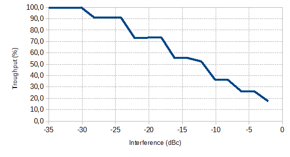 Lo que se puede apreciar en la gráfica resultante, es que no hay ninguna magia, porque no nos engañemos, nada se puede hacer en éste caso. La interferencia nos limita la relación señal a ruido en el canal, pero demuestra que el enlace aguanta sin ningún problema ésta situación tan complicada y se va degradando proporcionalmente. No es hasta los -2dBc (interferencia sólo 2dB por debajo de nuestra señal) cuando el enlace se desconecta, ya que el demodulador es incapaz de trabajar con tan poca relación señal a ruido.