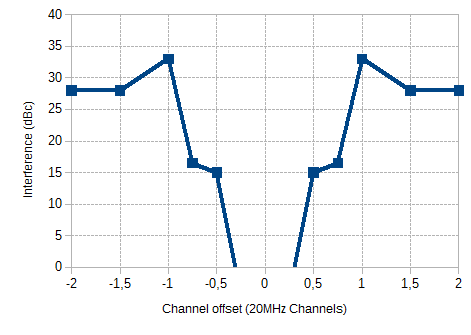 Conviene aclarar que la interferencia proviene de un AP Wifi MIMO 2×2 en canal de 20MHz, mientras que nuestro canal es de 10MHz, por lo que cuando la interferencia es de -2dBc, la relación a ruido de nuestro canal no se ve reducida a los 2dB de diferencia que hay entre la interferencia y nuestra señal sino 3dB más por la diferencia del ancho de banda, es decir 5dB, 1dB menos que los 6dB mínimos requeridos para BPSK-1/2.