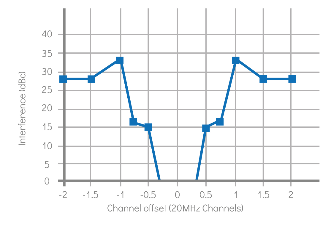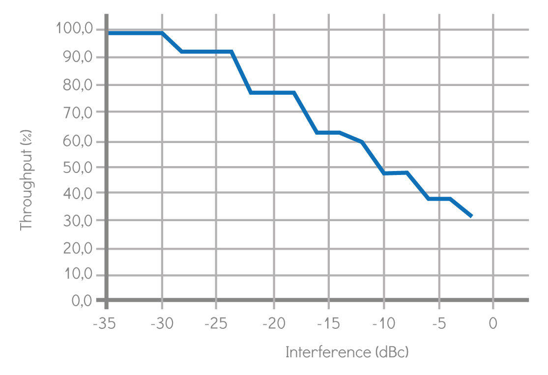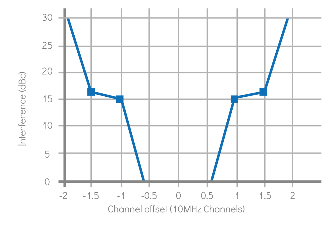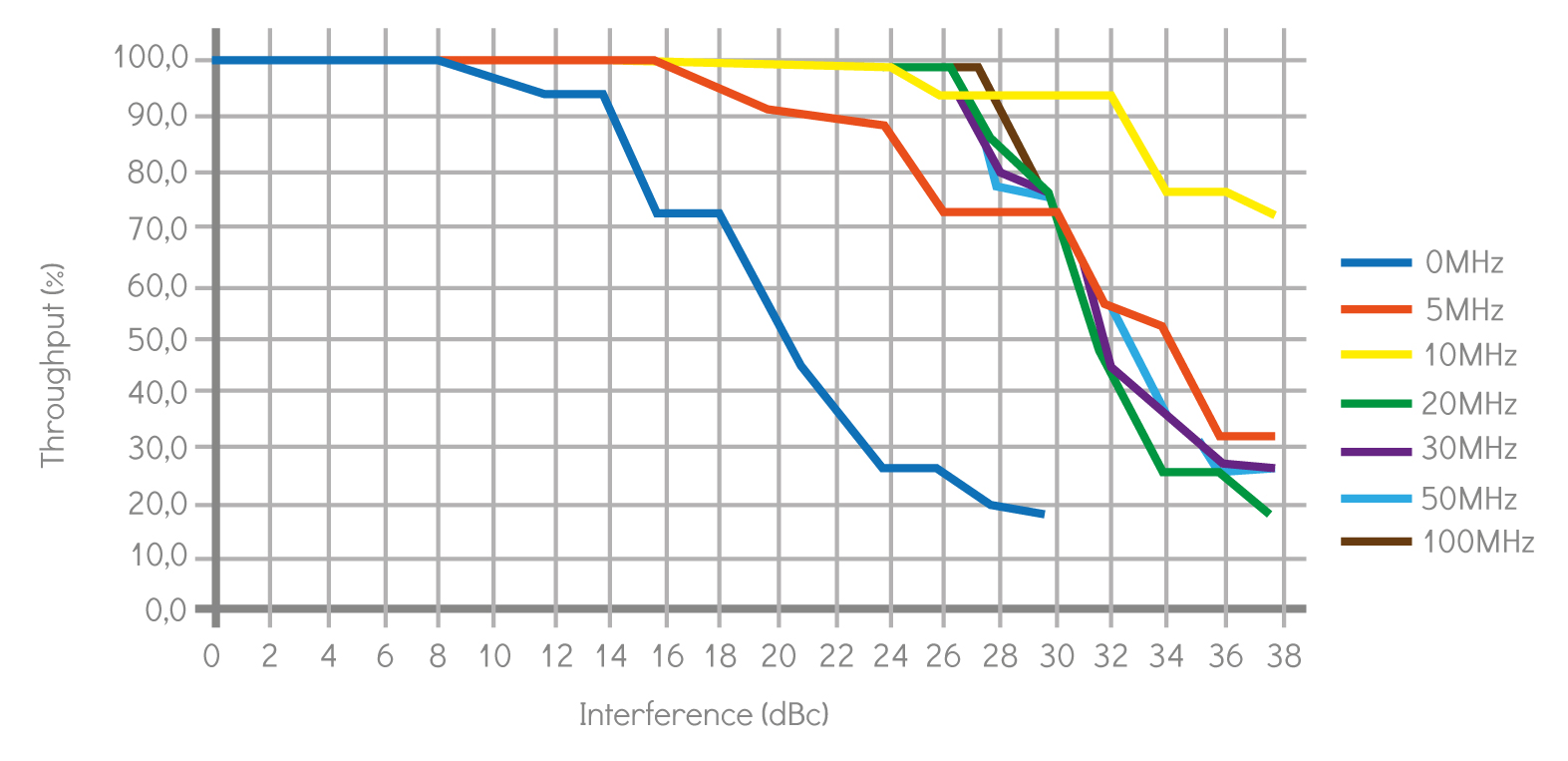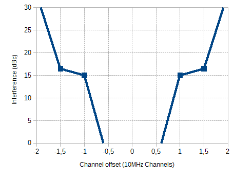 - A 5MHz, soporta una interferencia 17dB mayor que nuestra señal antes de degradarse. Como nuestra señal es de -50dBc, ésto significa que tendríamos que recibir una interferencia de más de -33dBm para empezar a notarla. Para perder el 50% de capacidad hacen falta 34dBc de interferencia.