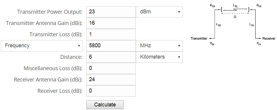 La calculadora online es muy sencilla de utilizar. Veamos un ejemplo donde la base tiene instalado un panel suministrado por Albentia (unos 16 dBi), la distancia al cliente es de unos 6 km y el cliente usa una antena de rejilla de 24 dBi. Abrimos la calculadora y configuramos los parámetros que nos pide.